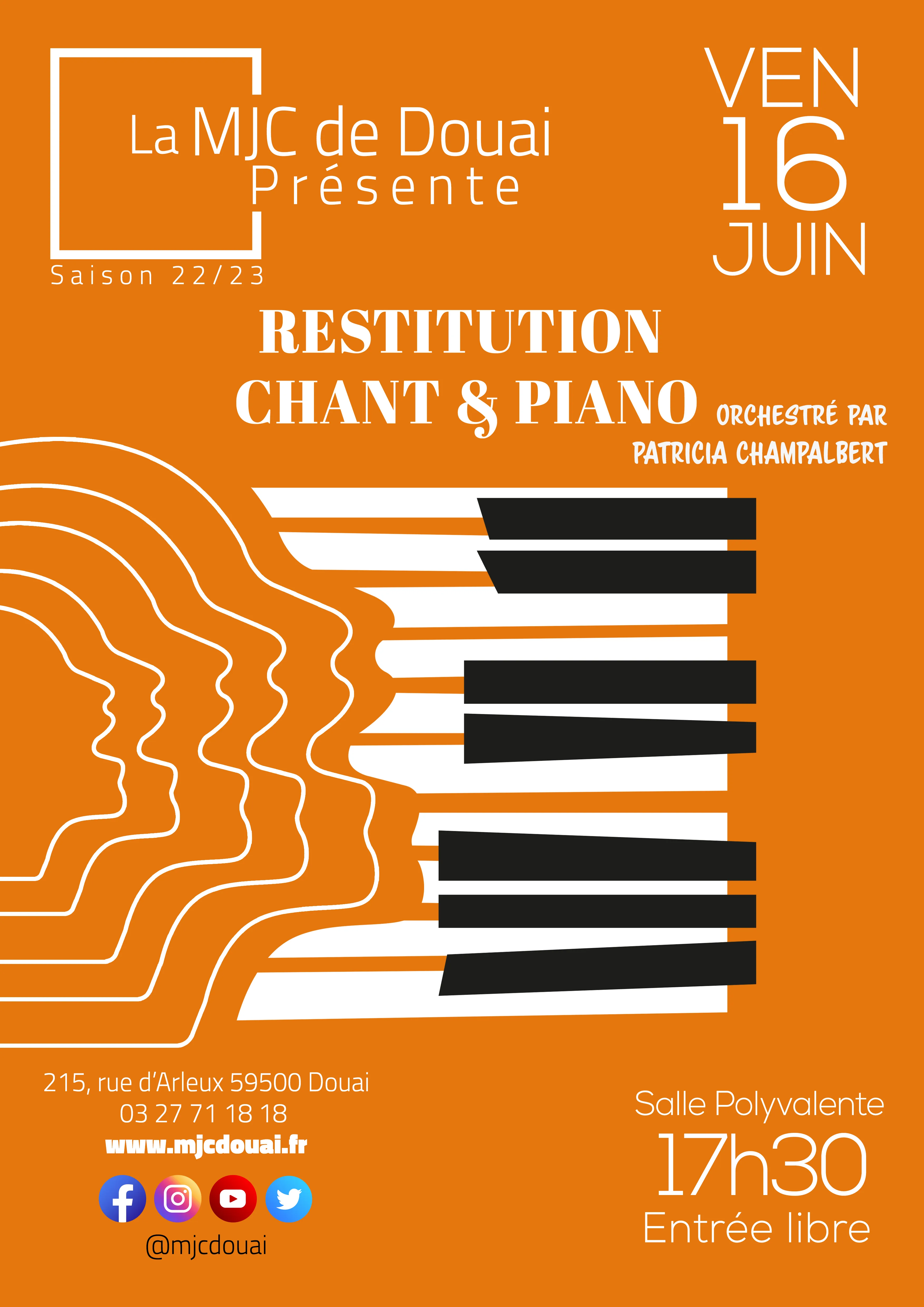 Comme chaque année venez assister à la restitution des cours « Groupe vocal » et « Atelier clavier » animé par Patricia CHAMPALBERT.