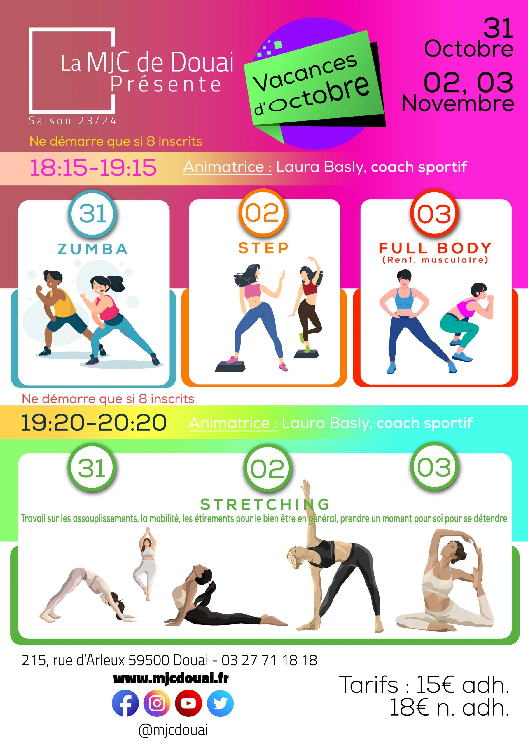 – 18h15 à 19h15 : 31/10 Zumba, 02/11 Step, 03/11 Full Body (stage 1)
