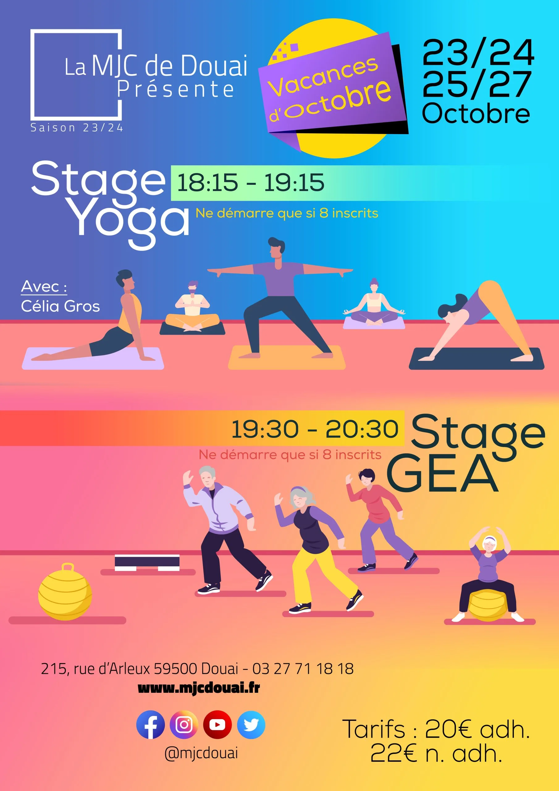 <P>Ces stages seront animés par Célia Gros.</P><P>Dates des stages : 23 , 24, 25 et 27 Octobre.</P><P>Les stages de yoga auront lieu de 18:15 à 19:15, ceux de GEA de 19:30 à 20:30.</P><P><B>Tarif pour les 4 séances d'un stage : 20€ adhérents, 22€ non adhérents.</B></P><P><I>Chaque stage ne démarre qu'à partir de 8 inscrits.</I></P>
